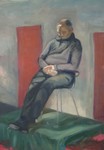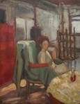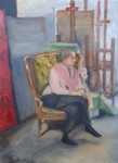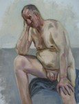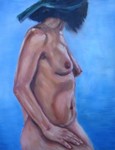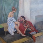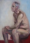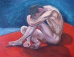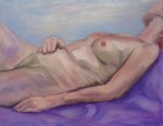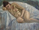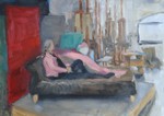 Liggend vrouwelijk naakt op rode doek met grijze achtergrond